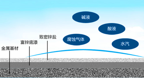 當涂膜上有部位損傷后,露出基體金屬,在較小面積內腐蝕電流能流向鋼鐵露出部分,則鋅的產(chǎn)物就沉積在此處形成一層保護膜,延緩腐蝕繼續(xù)發(fā)生。