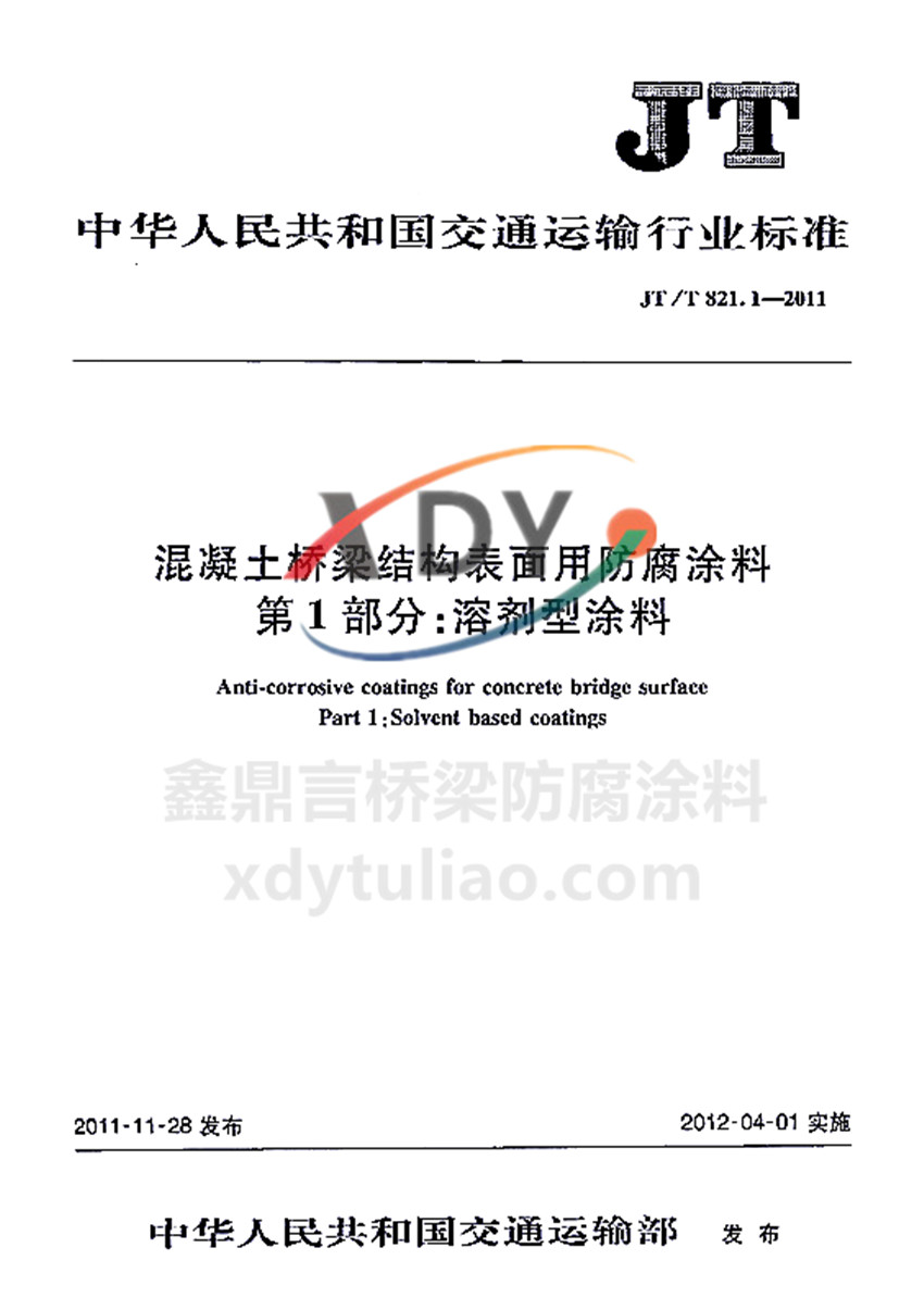 混凝土橋梁結(jié)構(gòu)表面用防腐涂料 第1部分:溶劑型涂料JT/T821.1-2011 中華人民共和國交通運輸行業(yè)標(biāo)準(zhǔn) JT/T821.1-2011 混凝土橋梁結(jié)構(gòu)表面用防腐涂料 第1部分:溶劑型涂料 Anti-corrosive coatings for concrete bridge surface Part 1:Solvent based coatings 2011-11-28發(fā)布 2012-04-