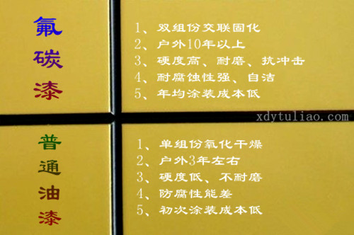 氟碳漆與普通漆有什么區(qū)別? 本文從一下幾個方面全面的比較了氟碳漆與普通漆的區(qū)別比較:樹脂、固化成膜、耐候性、機械性能、耐溶劑性能、耐熱性、使用期限、市場價、可涂布面積、每平米每年的成本