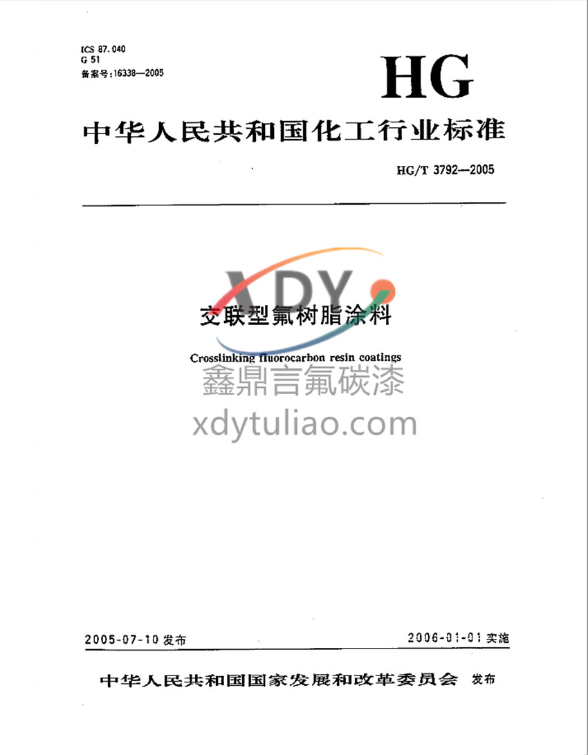 交聯(lián)型氟樹脂涂料化工行業(yè)標(biāo)準(zhǔn)HG/T 3792-2005:中華人民共和國化工行業(yè)標(biāo)準(zhǔn) 2005-07-10發(fā)布 2006-01-01實施 中華人民共和國國家發(fā)展和改革委員會發(fā)布 本標(biāo)準(zhǔn)適用于以含反應(yīng)性官能團(tuán)的氟樹脂為主要成膜物并加入顏填料(清漆不加)、溶劑、助劑等輔料作為主劑、以脂肪族多異氰酸酯樹脂為固化劑的雙組份常溫固化型建筑外墻用面漆和金屬表面用面漆。本標(biāo)準(zhǔn)還適用于以含反應(yīng)性官能團(tuán)的氟樹